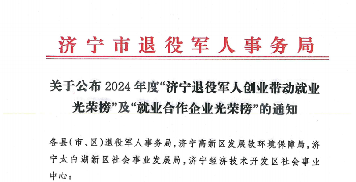 济宁市退役军人事务局公布2024年度“济宁退役军人创业带动就业光荣榜”及“就业合作企业光荣榜”,其中,山东天意机械股份有限公司位列“济宁退役军人就业合作企业光荣榜”。